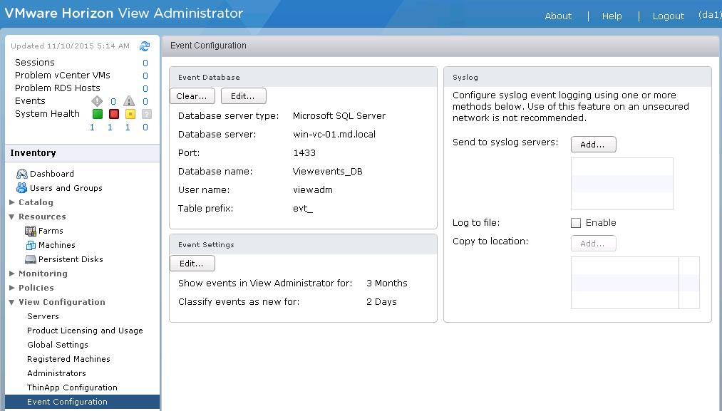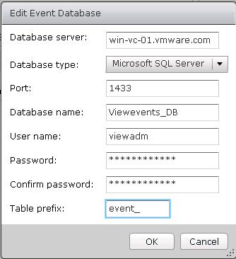 Configuring VMware Horizon View Event Database