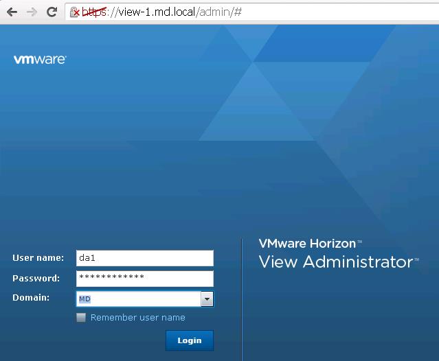 Once access permissions are assigned, Login to View administrator portal using the URL https://<IP or hostname of View connection server>/admin . Login with your View administrative credentials.