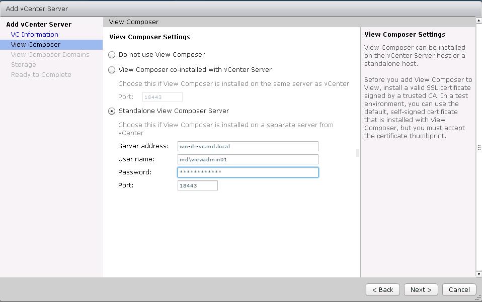We have installed Horizon View Composer in our previous section of this post. Below step will allow you to add your view composer to the View. You can install View composer on the vCenter server host or a standalone host. I have installed View composer on the separate server. So i have selected the option “Standalone View composer Server”. Provide the View composer server address and credentials information. Click on next.