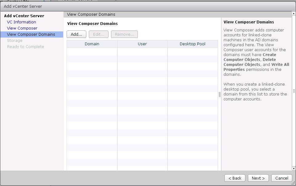 View Composer helps you to deploy linked clone desktops. View composer adds computer accounts for linked-clone machines in the Active Director domains configured under View composer domains. Click on Add to add view composer domains.