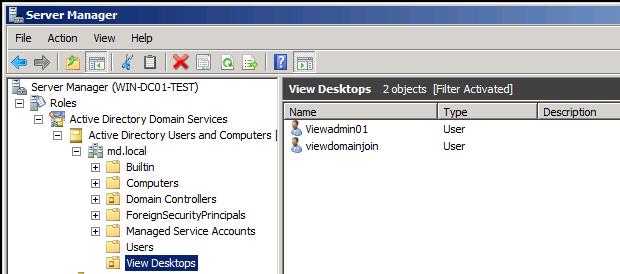 - viewdomainjoin – This account will be used by View Composer to join the virtual desktops to the domain in the OU, which you have created for your Virtual Desktop Infrastructure.