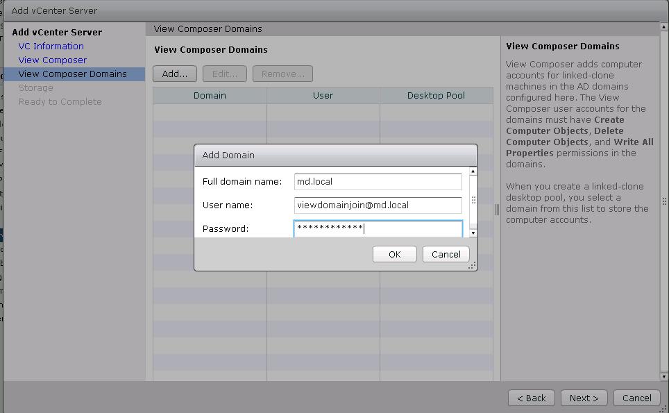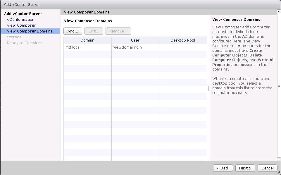 View Composer helps you to deploy linked clone desktops. View composer adds computer accounts for linked-clone machines in the Active Director domains configured under View composer domains. Click on Add to add view composer domains.
