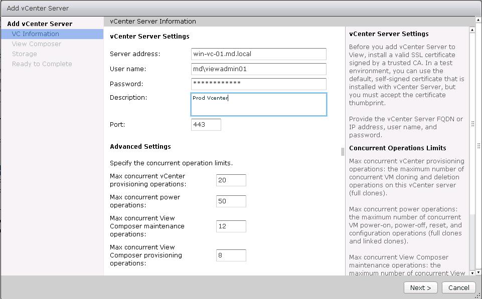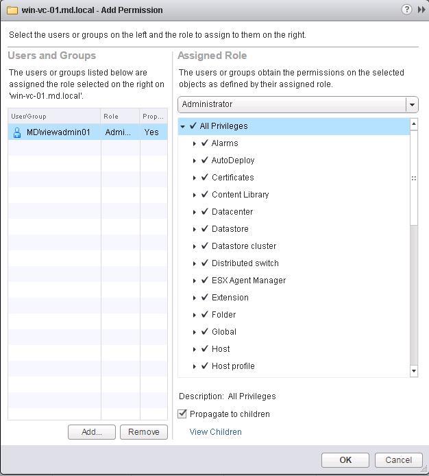 - viewadmin01 – This account will be used by the View Connection Server(s) to connect to vCenter server to provision and manage VMs.