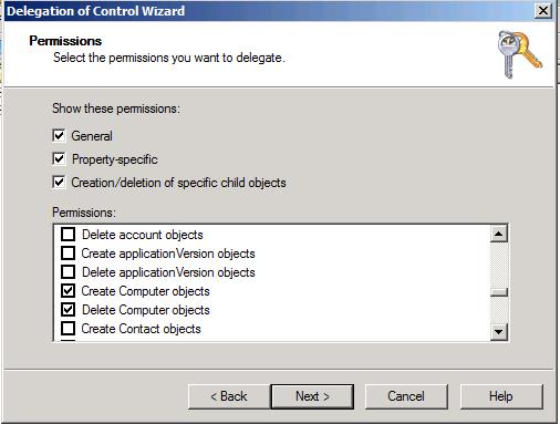 List Contents, Read All Properties, Write All Properties, Read Permissions, Create Computer Objects and Delete Computer Object