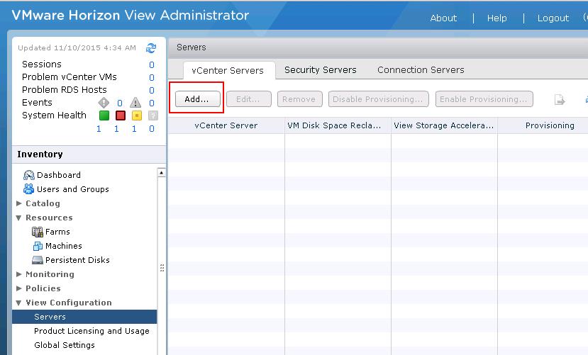 Select “Servers” under View Configuration. Select vCenter Servers and click on Add to add the vCenter Server.