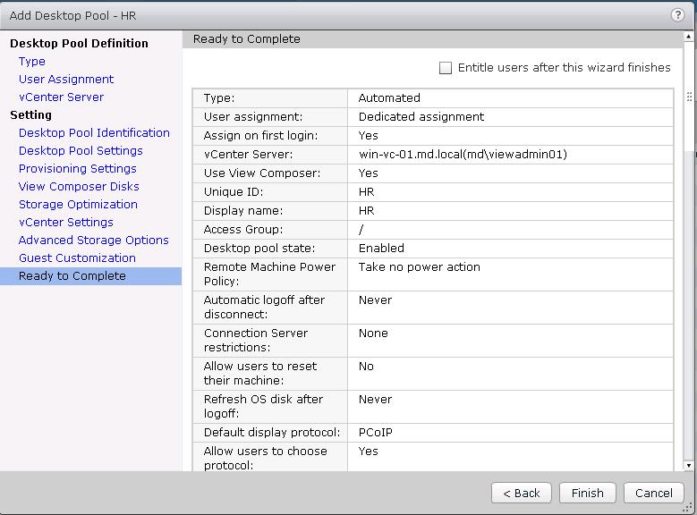 Review the desktop pool settings and Click on finish to start creation of Linked Clone desktop pool.