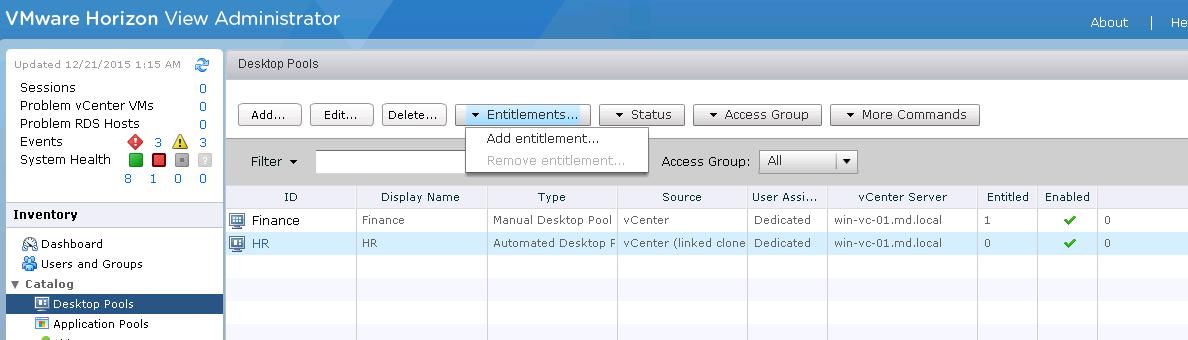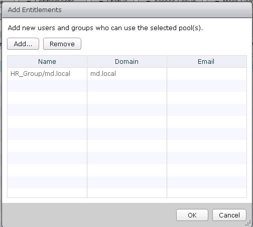 Once Linked Clone desktop pool “HR” is created . Select the desktop pool and Choose Add entitlement under Entitlements.