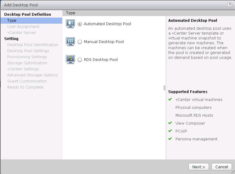 Select Automated Desktop Pool and click Next. You must always choose Automated Desktop Pool for linked clone deployments. Click on Next.
