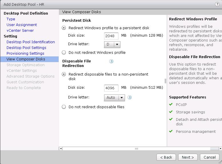 Configure View Composer Disks and click Next. Choose redirect windows profile to a persistent disk, this way users will experience same desktop every time they log on to their Desktop. Click on Next.
