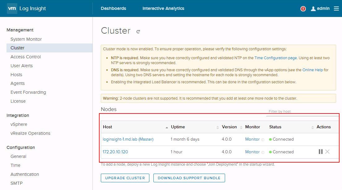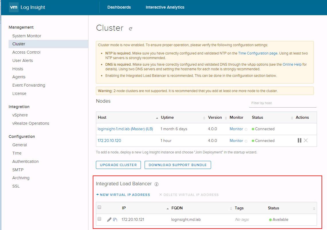 Once you have added the worker nodes into the vRealize Log Insight Cluster, You will be ready to configure the the Log Insight Integrated Load balancer.