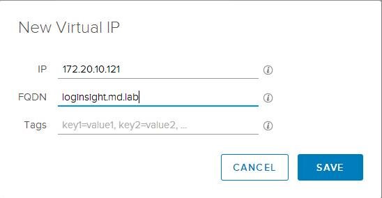 Specify the IP address and FQDN of the Virtual IP to be used as the Virtual IP of Log Insight Integrate Load balancer. Click on Save. You can configure multiple virtual IP addresses (vIPs) for the Integrated Load Balancer. You can also configure a list of static tags to each v IP so that each log message received from the vIP is annotated with the configured tags.