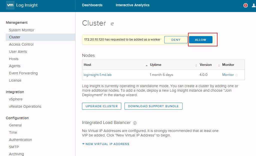Click on “Cluster” under Management option. You would have the notification about the worker node request. Click on Allow for the worker node to join the existing deployment and vRealize Log Insight begins to operate in a cluster.