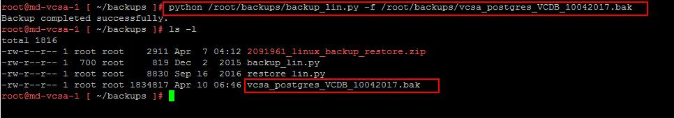 python /root/backups/backup_lin.py -f /root/backup/vcsa_postgres_VCDB_10042017.bak