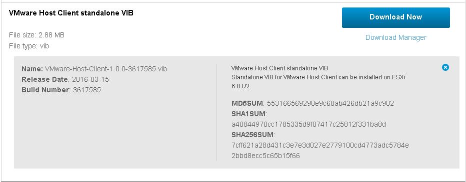 As similar to all softwares from VMware, you need to download and install VMware Host client vib file from the VMware website. This file needs to be installed on ESXi host. Download VMware Host Client. Since VMware Host is shipped with vSphere 6.0 Update 2. Ensure you have selected 6.0U2 from select version drop-down.