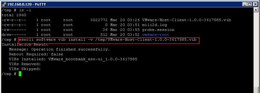 esxcli software vib install -v /tmp/VMware-Host-Client-1.0.0-3617585.vib