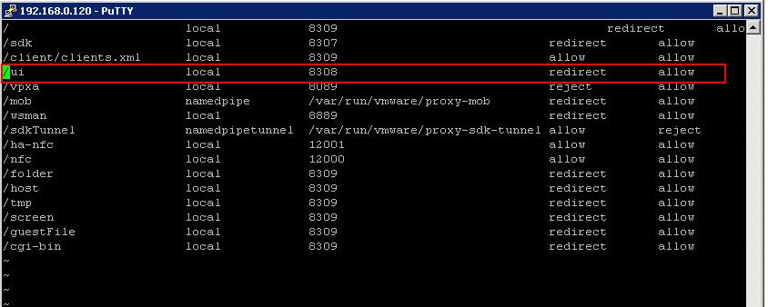 Edit the config file “/etc/vmware/rhttpproxy/endpoints.conf” using VI Editor