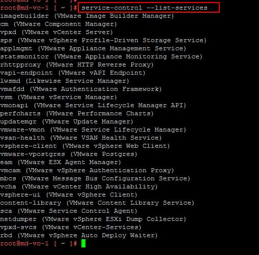 To list all the services running on vCenter Server appliance. Services list may vary based on the deployment type i.e vCenter appliance, external Platform services controller and also for embedded vCenter server appliance. Below one in the example is for vCenter server with external platform services controller. command remains the same for all deployment.