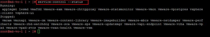 Execute the below command to see the status of all the services in the vCenter server appliance. This command lists all the running and stopped services on the appliance.
