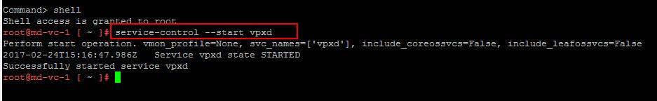 Execute the below command to start the service in the vCenter server appliance. Where ServiceName corresponds to one of the services identified from the list services command in step 1. I am starting the vpxd service (VMware vCenter Server service) in the below example. Syntax for the command for all services is same but service name varies.