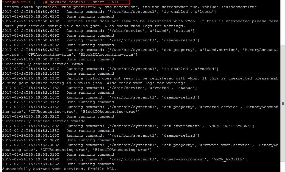 Execute the below command to start all the services in the vCenter Server appliance 6.5. It will start all the services running on that particular appliance based on the installed roles i.e vCenter, External PSC or Embedded vCenter Server.
