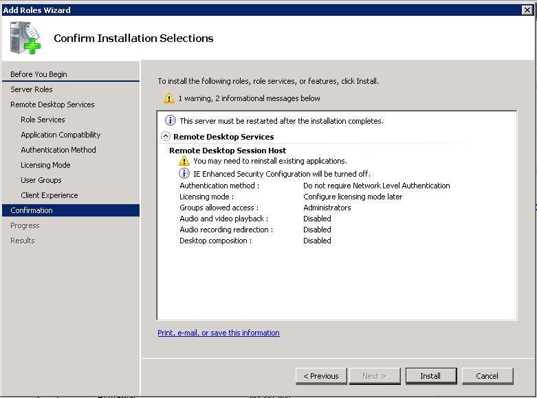 On the Confirm Installation Selections page, verify that the RD Session Host role service will be installed, and then click Install