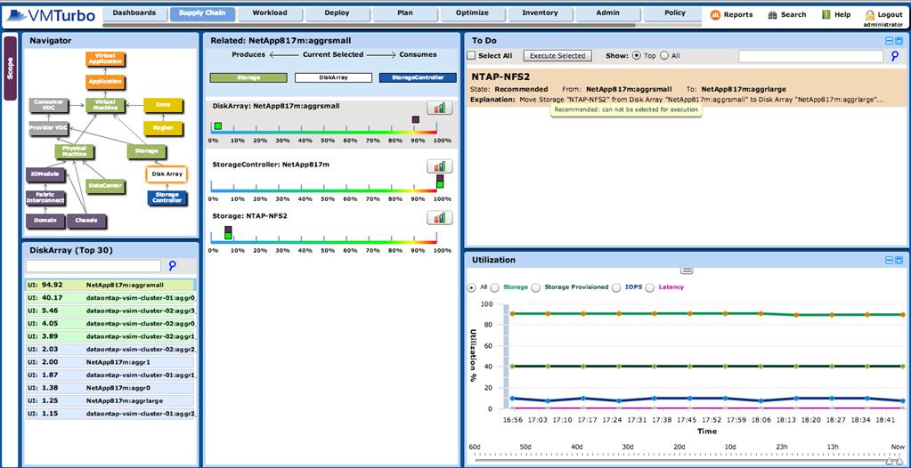 VMTurbo Operation manager continuously analyzes the real-time performance, resource capacity, Service level priorities and System constraints across your virtualized environment to determine, implement and adjust resource configurations and workload placements.  Operations Manager is an application performance control system. It continuously matches any application workload demand to any infrastructure supply.