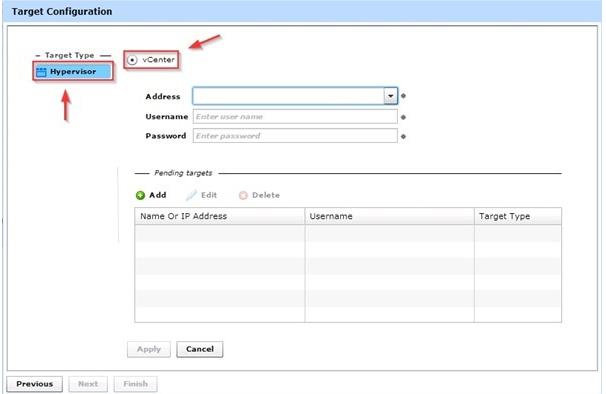 5.  Add Targets to collect the metrics. With VMTurbo Operations Manager Lite version, you will be only able to add Hypervisor as Target Type and vCenter option is automatically selected.
