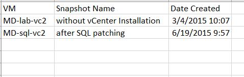 Virtual Machines with 3 days older VM Snapshots will be exported and saved in the Microsoft Excel output file with the filename “VMSnapshot3DaysOld_Today_Day.CSV” under the same directory where the PowerCLI Script “VMSnapshot3Daysold.PS1” is located.