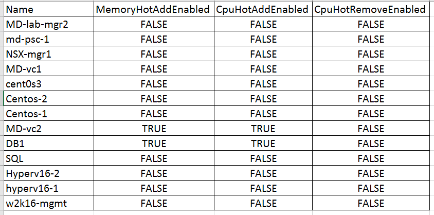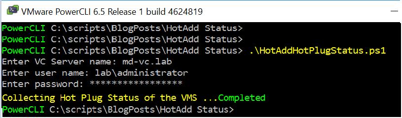 - Execute the Script in PowerCLI “.\HotAddHotPlugStatus.ps1″