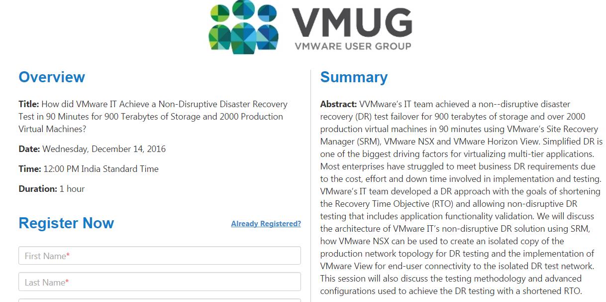 For those who have missed my VMworld Session STO7443 – How did VMware IT Achieve a Non-Disruptive Disaster Recovery Test in 90 Minutes for 900 Terabytes of Storage and 2000 Production Virtual Machines?, There is an another chance to attend my session in VMware User Group (VMUG Session) which will be a webcast happening on Wednesday, December 14, 2016, 12:00 PM IST. This session is all about how did VMware’s Internal IT team developed an Non-disruptive Disaster Recovery Test solution using VMware Site Recovery Manager , VMware NSX & VMware Horizon View. With this Non-disruptive DR Test design, we were able to perform end to end application validation including Business systems. I believe this session could be useful to you to design and develop an Non-Disruptive Disaster recovery test without any downtime to your production infrastructure.