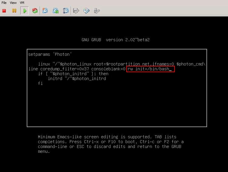 - When VM starts to Boot (PhtonOS splash screen), press e key to enter the GNU GRUB Edit Menu.
