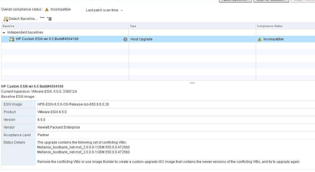 It is clear that ESXi 6.5 upgrade baseline is showing as “incompatible” during the Scan for upgrades in the update manager. so we need to remove the conflicting VIB’s from the esxi host.