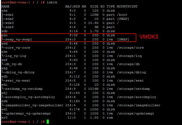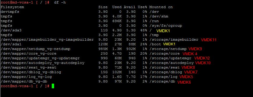 Let’s login to the VCSA appliance and take a look at the VCSA 6.5 VMDK Partitions & Mount Points from the server side. This VCSA in the below example is the VCSA 6.5 embedded PSC deployment. I have marked each of the VCSA 6.5 mount point with its respective VMDK numbers. You can login to the VCSA 6.5 appliance and execute the below command to read the VCSA 6.5 VMDK Partitions & Mount Points information.