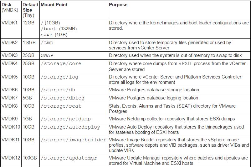 Below are the VCSA 6.5 VMDK Partitions & Mount Points layout information based on the Tiny deployment of VCSA 6.5.