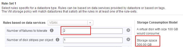 If you increase the Number of failure to tolerate to 2 then 100 Gb disk would consume 300 GB storage space on the VSAN datastore. It stores 3 copies of VM disk in the VSAN datstore to protect against host and device failures.