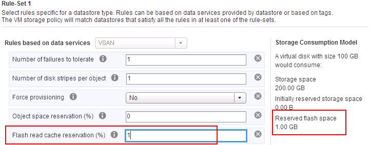 This option helps us to explicitly reserve the flash capacity as read cache for the virtual machine object. It will be specified as a percentage of the logical size of the virtual machine disk (vmdk) object. This reserved flash capacity cannot be used by other VM objects. Remaining unreserved flash capacity will be shared among all other objects. Default value is 0% and maximum value is 100%