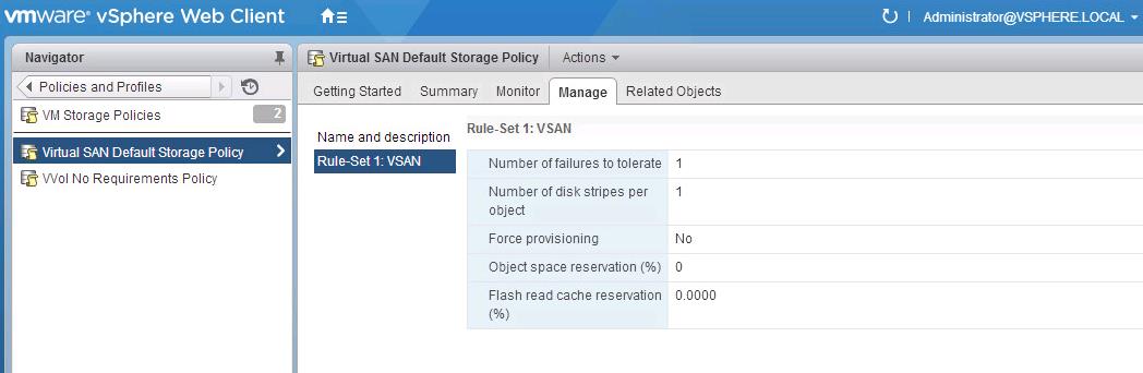 In this article, We will discuss in detail about the default Virtual SAN storage policies with example of each rule set available under default policy .There are 5 default rule sets available with the default Virtual SAN storage policies. 5 Virtual SAN rule sets are:
