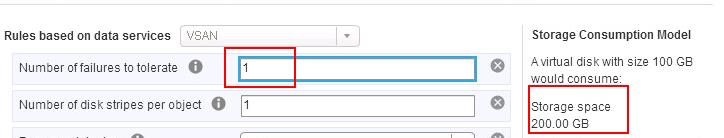 For example, If you define failures to tolerate to 1, then each piece of data written is stored in 2 places.It takes double the storage consumption to store virtual machine objects to protect against failures. Example, Vitual disk with 100 GB would consume 200 GB of storage space on the VSAN cluster.