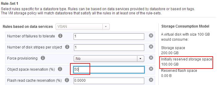Take an example of Virtual disk with the Size of 100 GB and FTT configured to 1 would consume 200 GB space in the VSAN datastore. If you reserve the Object Space reservation to 50% would initially reserve 100 GB storage space on the VSAN object for each of the Virtual machine objects. If Object Space Reservation is set to 100%, all of the storage capacity requirements of the VM are offered up front (thick). This will be lazy zeroed thick (LZT) format and not eager zeroed thick (EZT).