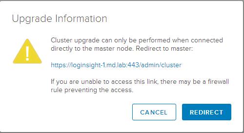 As I have already mentioned, When you logged into the vRealize Log Insight Integrated Load BalancerURL, Upgrade is Not possible. You will be redirected to the Log Insight Master Node URL. Click on Redirect.