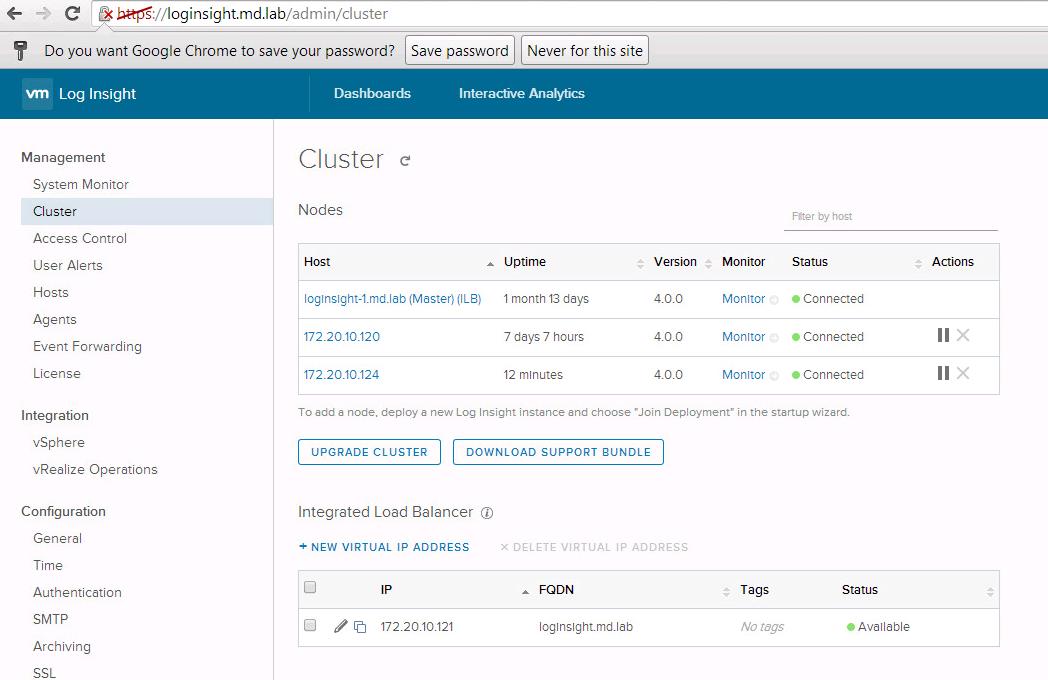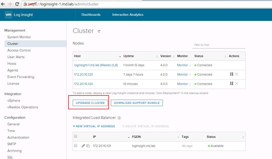 Once you are redirected to the Log Insight Master Node URL. Click on Upgrade Cluster