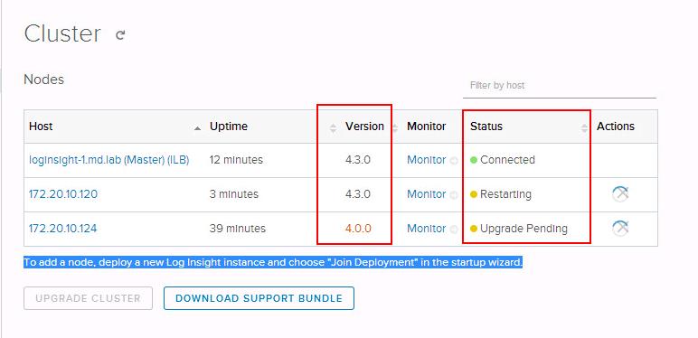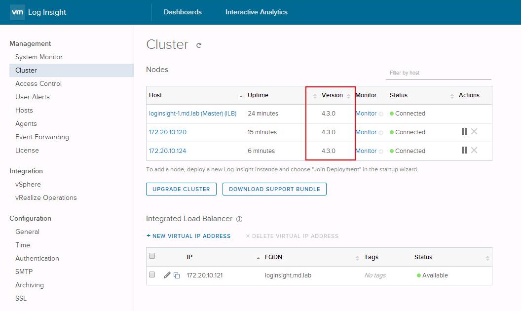 All the nodes in the vRealize Log Insight cluster is upgraded to 4.3.0 and also Status is connected.