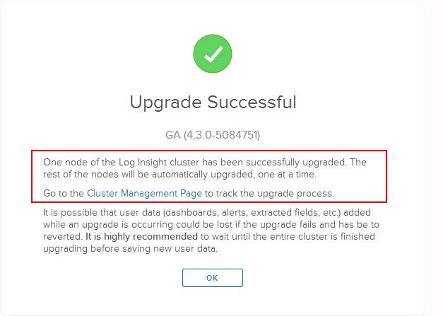 If any issue happened to any of the nodes during the upgrade process, The entire cluster will be automatically rolled back to the existing version prior to the upgrade. Cluster Configuration will be reverted to a known-good state captured before the vRealize Log Inisght cluster Upgrade. No loss to the ingested events. A system notification is sent when rollback finishes. After the issue is investigated and fixed, you can retry the upgrade.