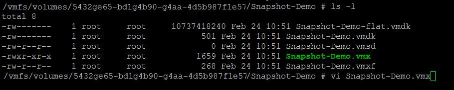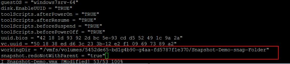 workingDir = “/vmfs/volumes/5452de65-bd1g4b90-g4aa-fd5787f1e370/Snapshot-Demo-snap-Folder”
