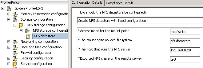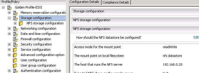 This setting captures the storage (only NFS) configuration of the reference host. It ensures that NFS configuration of ESX hosts is consistent across the environment by applying this profile.