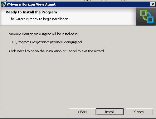 Click on Install to start the VMware View agent installation on the Remote Desktop session host.