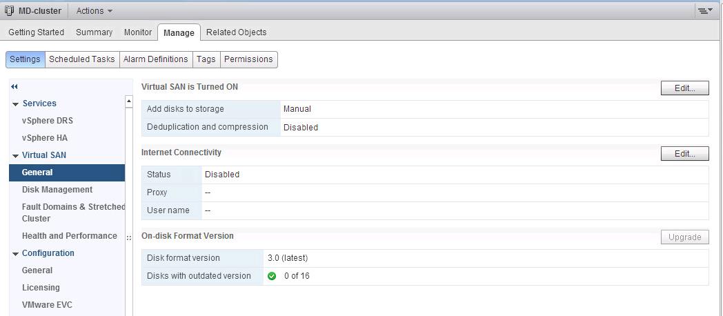My Virtual SAN is Turned on Now. You can see the status of the Virtual SAN cluster under Select Cluster > Manage > Virtual SAN > General . You can notice the Virtual SAN on-disk format version. Which is 3.0 (latest for VMware Virtual SAN 6.2). Disks with outdated version, etc.