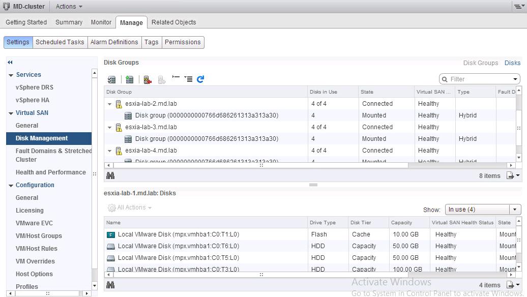 Under the Disk management option, You can notice the disk group created under each of my 4 ESXi hosts and Each disk group contains 4 disks (1 SSD and 3 HDD)