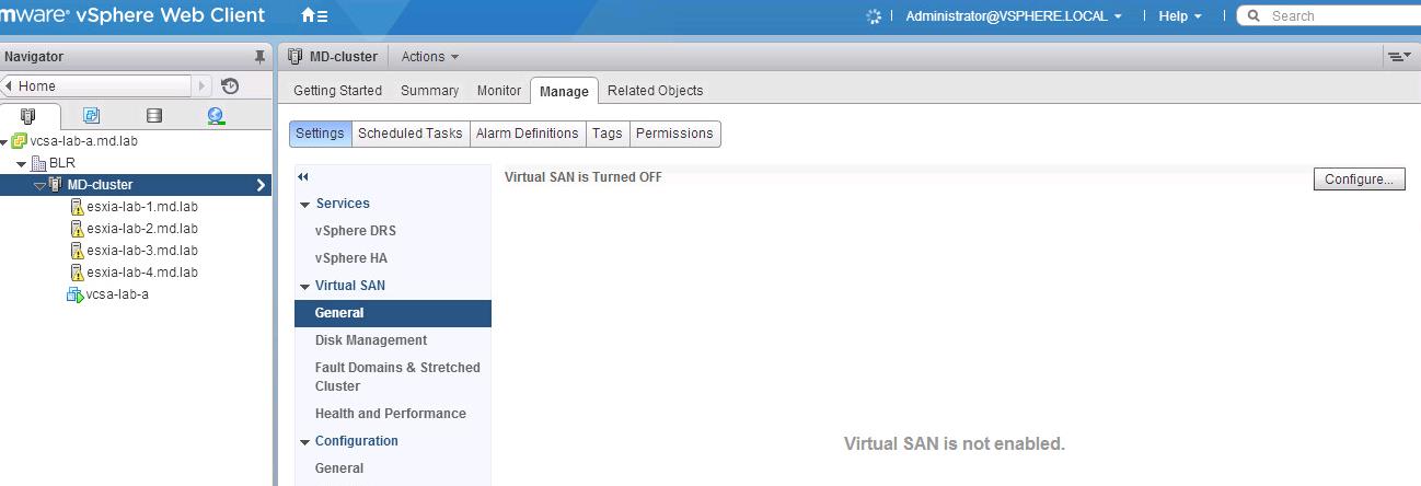 To enable vSAN on the cluster ,login to vSphere WebClient and Select Cluster > Manage > Virtual SAN > General -> Click on Configure
