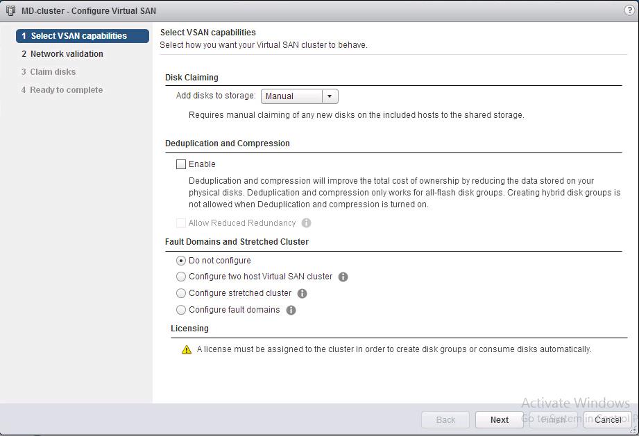Select the Automatic or Manual from the drop-down under Disk Claiming. I am going to use Manual method to manually claim the disks for my disk group. You can enable Deduplication and Compression for your virtual SAN cluster. Deduplication and compression will improve the total cost of ownership by reducing the data stored on your physical disks. Deduplication and compression works only for all-flash disks groups. I am creating Hybrid disk group for my virtual san setup So i didn’t enabled the option of Deduplication and compression. You can also configure Fault domains and Stretched cluster under this wizard. Click on Next.